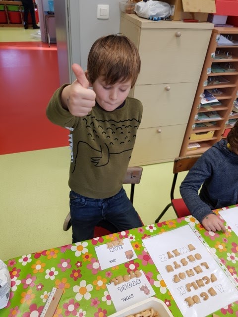 De schoorsteenpiet leerde ons pakjes sorteren volgens het aantal woordstukjes in onze naam.